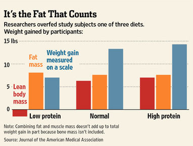 But what about the low protein diet? Though the total weight gain in this group was significantly less 100% of the total 6.97 lbs gained was body fat. To make matters worse this group also lost 1.5 lbs of their original lean body mass putting their total body fat gain nearly 8.5 lbs. This fat gain is 1.5 lbs higher than the body fat gain of either the normal or high protein groups. In addition, the resting energy expenditure for this group actually decreased as lean muscle was turned into body fat. “There is no health-related benefit to a reduction in lean body mass,” said Dr. Bray. “That’s not what you want to happen.”