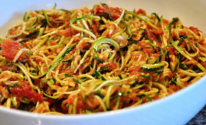 - Pour simmering sauce over raw zucchillini noodles in large serving bowl and let stand until desired “noodle” tenderness is achieved (5 – 10 minutes).