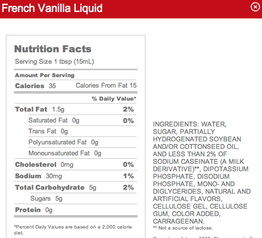 So, when I took charge of my health and really started paying attention to what I was putting in my body it became obvious the totally delicious yet totally fake creamers had to go. I mean, just look at this stuff…and this is a simple French Vanilla flavor!